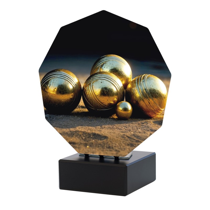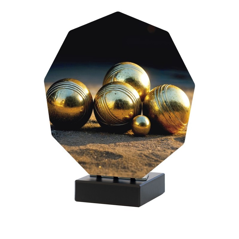 Disponible en tres tamaños, cuenta con una sólida base de mármol que realza su presencia en cualquier entrega de premios. Es perfecto para reconocer a los mejores jugadores, equipos o incluso para homenajes especiales dentro del ámbito de la petanca.