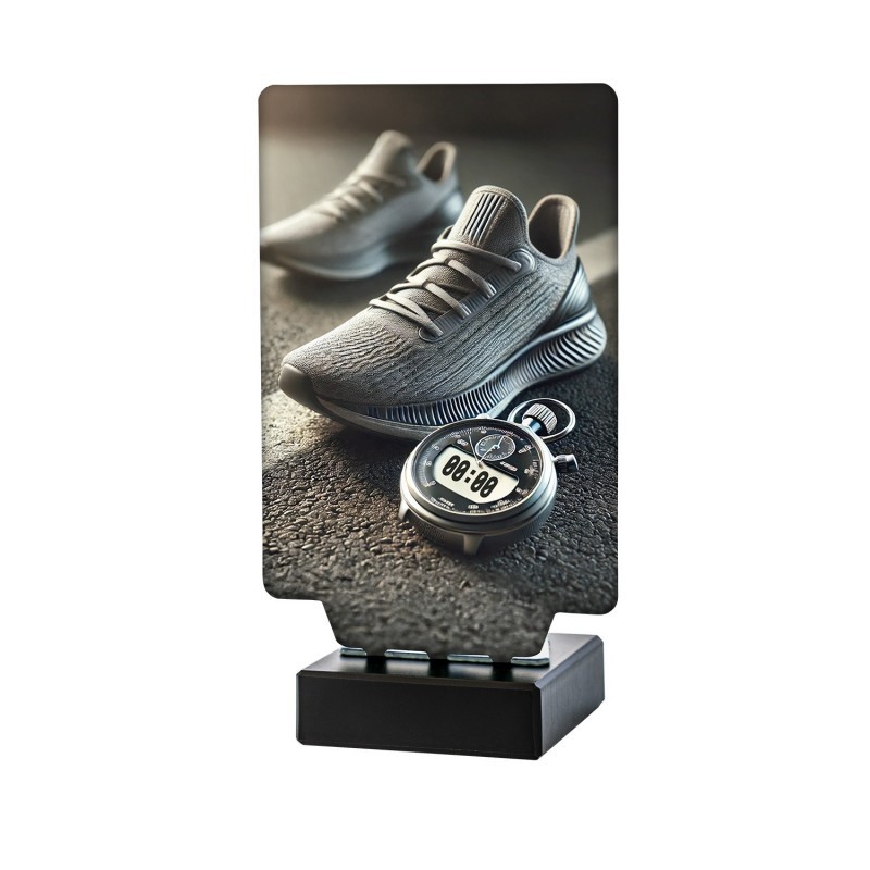 Trofeo metálico para premiar a los campeones de running, con base de mármol. Disponible en tres tamaños y personalizable.