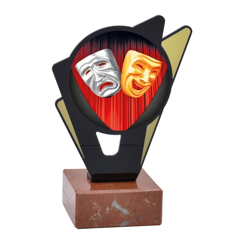 Trofeo de metacrilato de la serie 0031 con disco central de teatro. Fabricado en metacrilato con una línea moderna y actual, de gran calidad y con base de mármol. Trofeo ideal para entregar a participantes competiciones artísticas y de teatro.