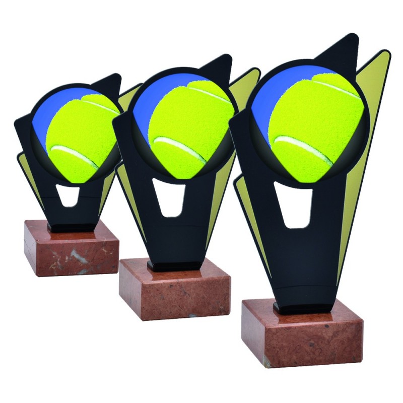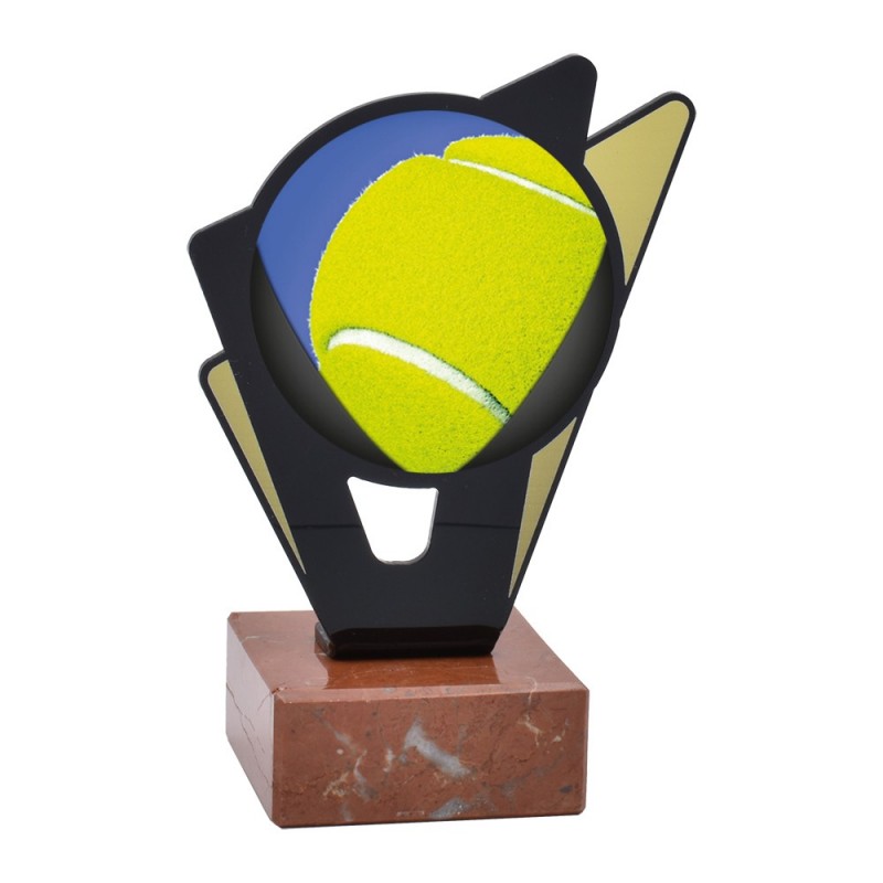 Trofeo deportivo de metacrilato de la serie 0031 con disco central de una pelota de tenis o pádel. Fabricado en metacrilato con una línea moderna y actual, de gran calidad y con base de mármol. Trofeo ideal para entregar a participantes, campeones y finalistas de competiciones y torneos de tenis y pádel.
