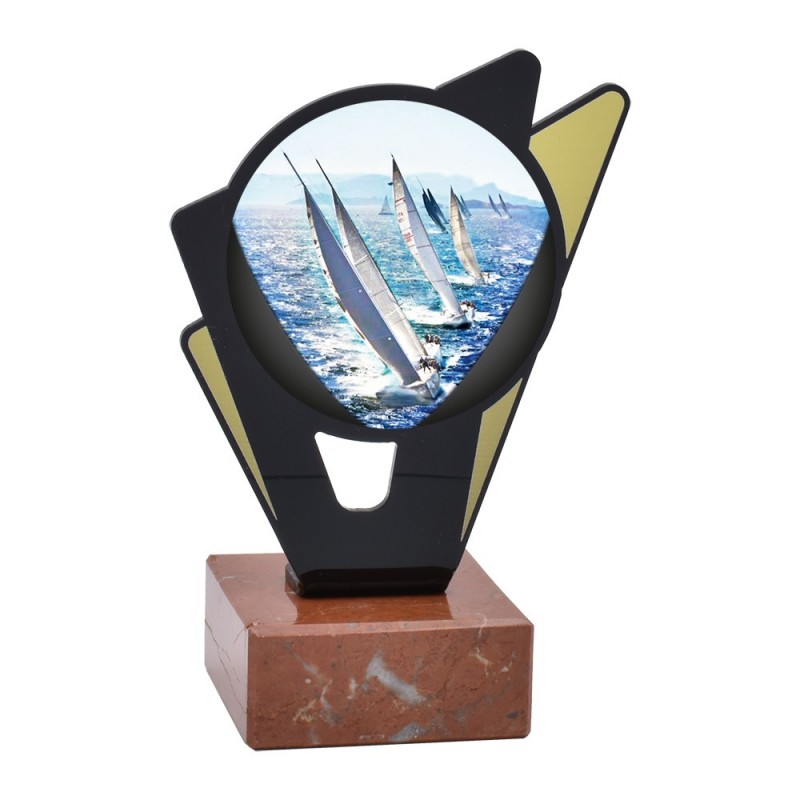 Trofeo deportivo de metacrilato de la serie 0031 con disco central de barcos de vela en una competición. Fabricado en metacrilato con una línea moderna y actual, de gran calidad y con base de mármol. Trofeo ideal para entregar a participantes, campeones y finalistas de competiciones de vela deportiva.