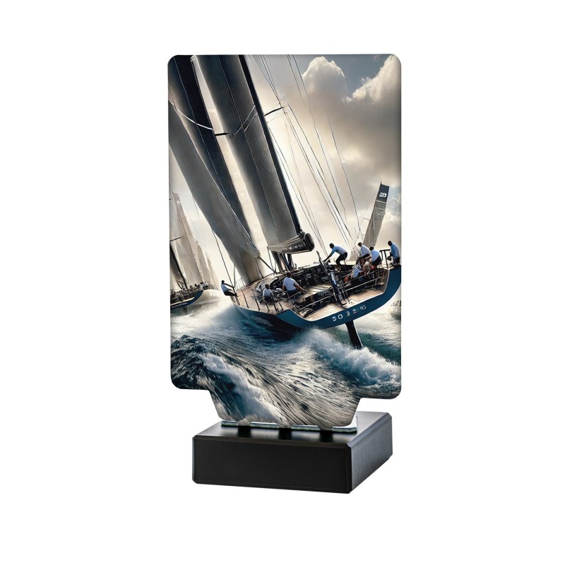 Con un diseño sofisticado y dinámico, este trofeo simboliza el arduo trabajo, la estrategia y la destreza necesarias para ganar en las regatas de competición. La base de mármol le da un toque de distinción, asegurando que cada premiación sea un reflejo de la excelencia alcanzada en el mar.