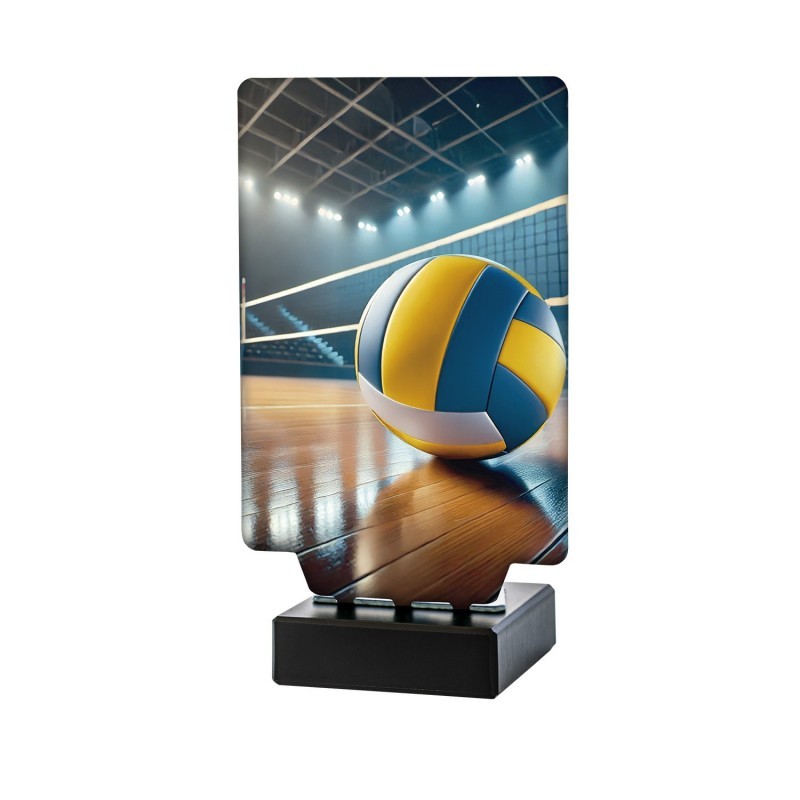 El trofeo de Voleibol realizado en un pieza metálica tiene un diseño elegante y moderno, ideal para premiar a los campeones de voleibol en todas sus categorías. Con base de mármol y totalmente personalizables, estos trofeos destacan por su distinción y prestigio.